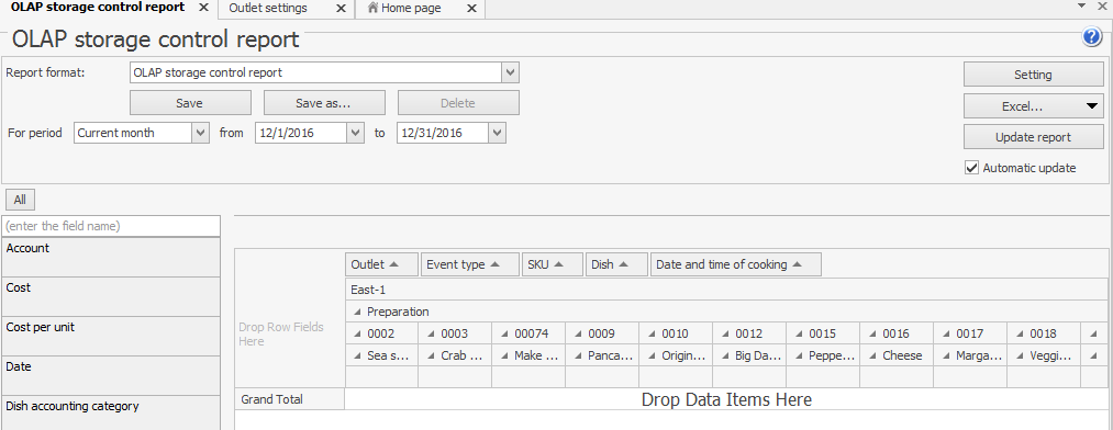 Aby przeglądać i analizować dane dotyczące przygotowywania i sprzedaży potraw, których okres przydatności jest kontrolowany, możesz uruchomić raport kontroli magazynu OLAP w sekcji Raporty.