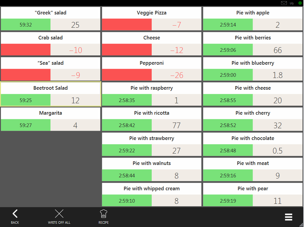 - Czerwony, jeśli danie jest przeterminowane. W takim przypadku pozostały czas staje się ujemny.