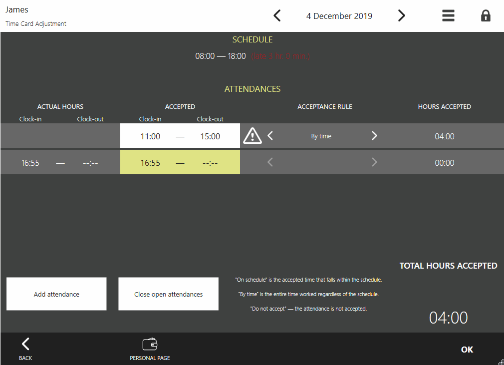 Jeśli pracownik jeszcze się nie wymeldował, ta frekwencja nie może zostać zaakceptowana. W tym celu musisz wymusić zamknięcie takiej zmiany, stukając Zamknij otwarte frekwencje, a dopiero potem ją zaakceptować.