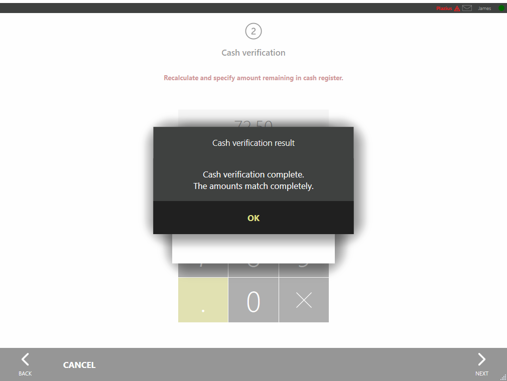 Jeśli raport jest poprawny, stuknij DALEJ lub stuknij ZAKOŃCZ, jeśli wpłaty do kasy nie są dozwolone.