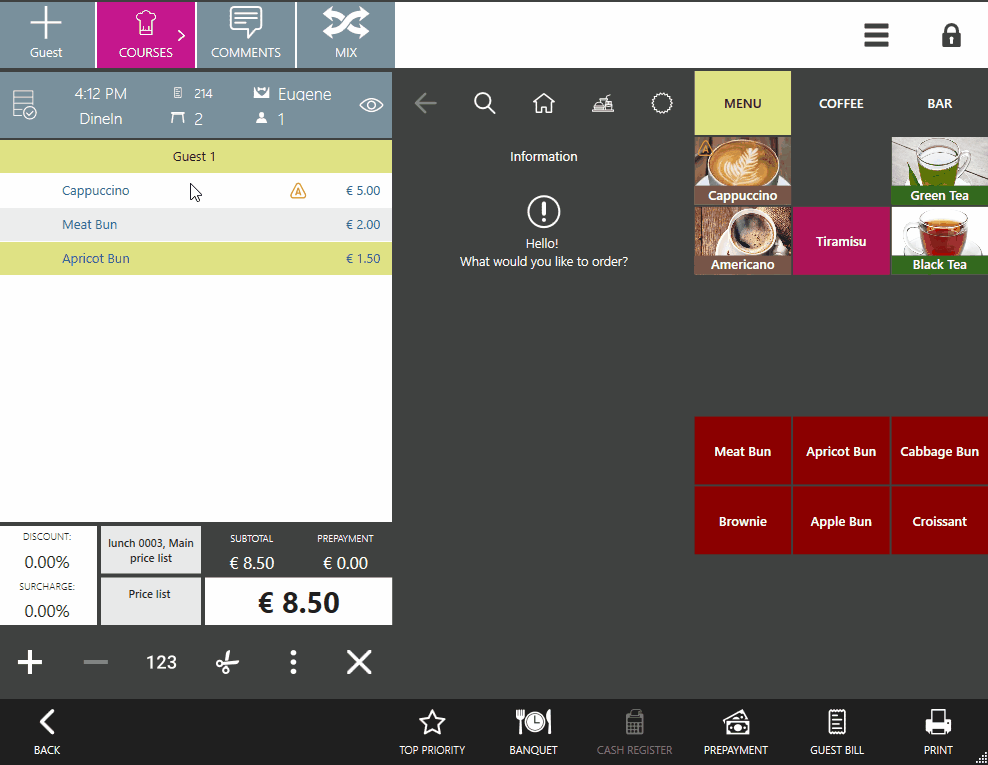 Odbierz zamówienie i wybierz gościa. Pozycje zamówione przez tego gościa zostaną podświetlone.