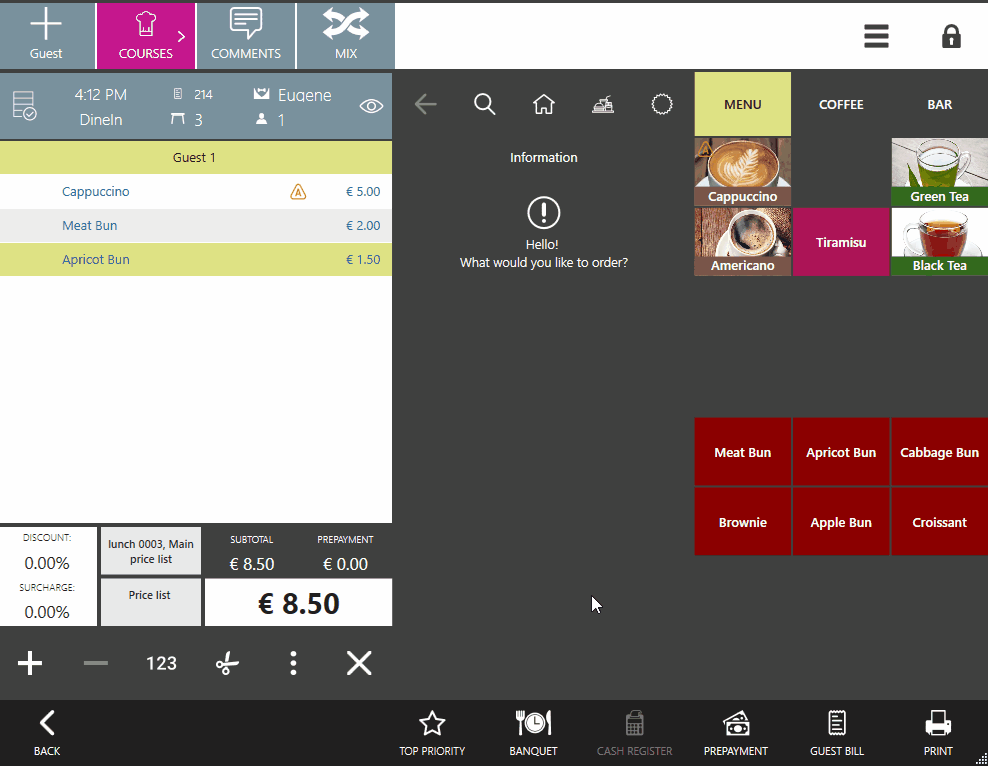 Jeśli nie drukujesz rachunku gościa w momencie przeniesienia, zostaniesz przeniesiony z powrotem do zamówienia. Aby rozliczyć gościa, który zamierza odejść, musisz podzielić rachunek. Szczegóły znajdziesz w rozdziale Dzielenie Rachunków.