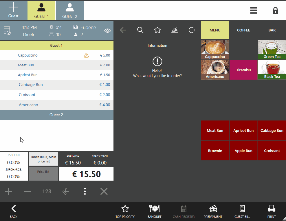 Jeśli niektórzy goście są gotowi do zapłaty, stuknij Rachunek Gościa, wybierz tych gości i stuknij OK. Rachunek zostanie podzielony na dwie części. Kasjer może przyjąć płatność od tych gości.