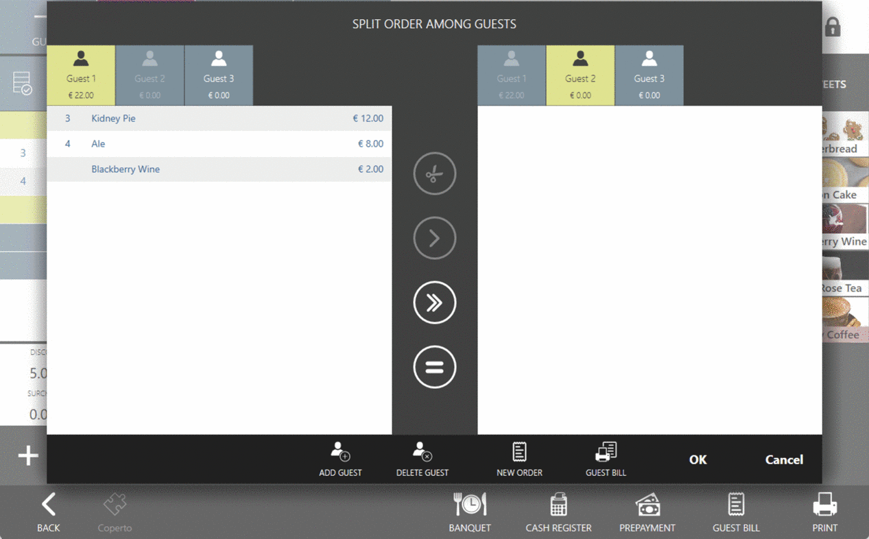 Zostaniesz przeniesiony do okna, w którym możesz podzielić zamówienie między gości. Szczegóły znajdziesz w artykule Okno Zamówienia. -