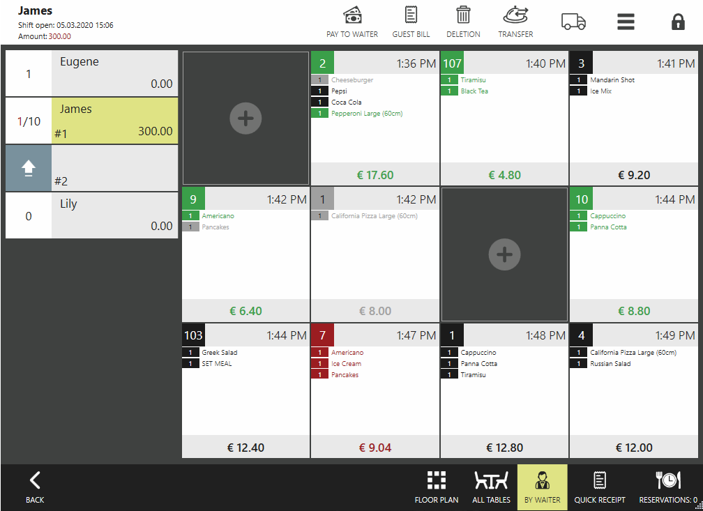 Jeśli kelner ma więcej niż 12 otwartych zamówień, a komórki nie mieszczą się na ekranie, system dodaje zakładki (#2, #3 itd.). Aby zobaczyć wszystkie zamówienia kelnera, wybierz kelnera i stuknij ZAMÓWIENIA .