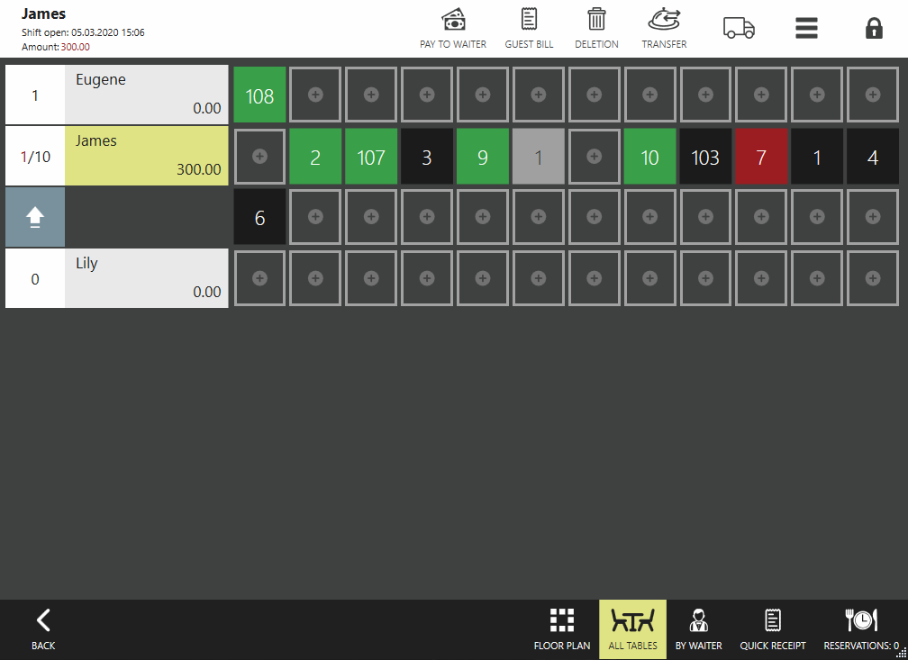 - WSZYSTKIE STOLIKI. Pokazuje listę zalogowanych kelnerów (lub przynajmniej takich, którzy mają otwarte zamówienie) wraz ze stolikami, które obsługują.