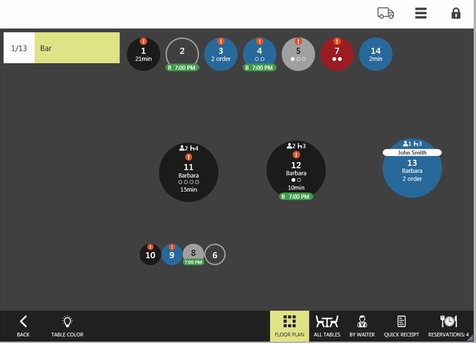 W zależności od rozmiaru stolika, pokazują one dodatkowe informacje, takie jak imię gościa, nazwisko kelnera, czas od złożenia zamówienia, szczegóły kursu (czy podano czy nie) i tak dalej, a także wskaźnik problemu.