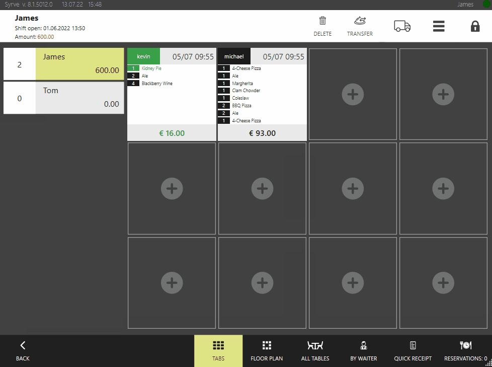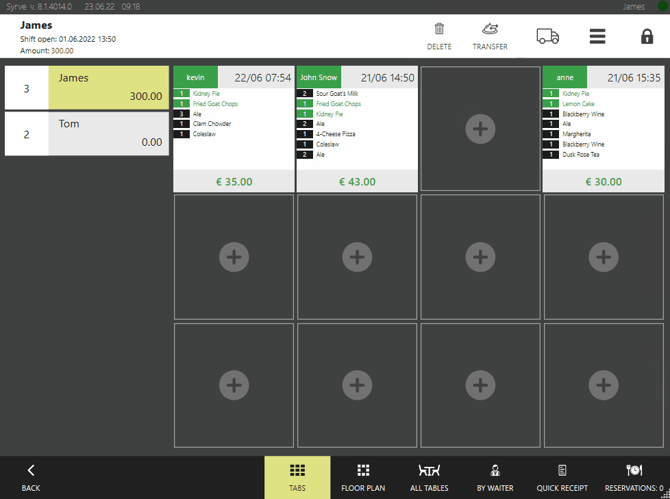 Gdy nowi goście pojawią się w Twoim barze, otwórz dla nich kartę. Aby to zrobić, stuknij Otwórz kartę w oknie Szybki paragon lub przejdź do trybu widoku planu piętra KARTY i naciśnij . Nadaj jej nazwę, abyś pamiętał, którą kartę wybrać przy dodawaniu kolejnych pozycji. Przyjmij ich pierwsze zamówienia i naciśnij DRUKUJ.