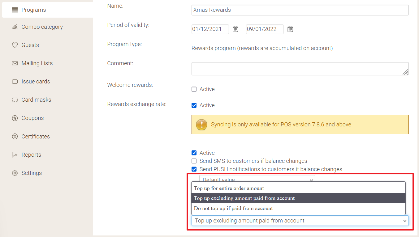 Przejdź do kreatora lojalności w portalu restauratora. Wejdź do Programy i wybierz program nagród lub program pieniężny. Kliknij Ustawienia doładowania konta przy płatności i wybierz jedną z opcji z rozwijanego menu, jak pokazano na obrazku.