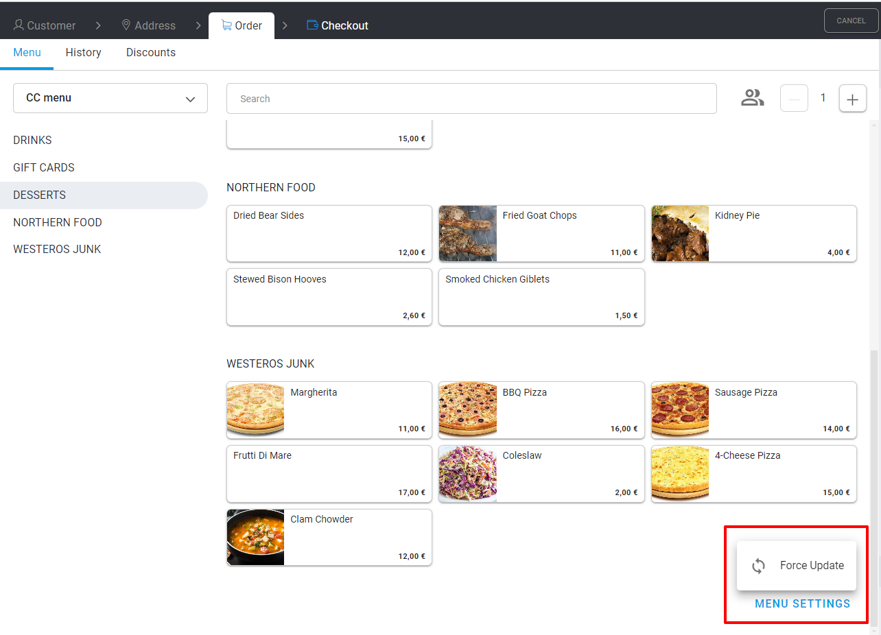 Menu zewnętrzne są teraz łatwiejsze w obsłudze w call center. Jeśli wymagana jest synchronizacja menu, wystarczy przejść do zakładki Menu na ekranie przyjmowania zamówień i kliknąć Wymuś aktualizację na dole strony.