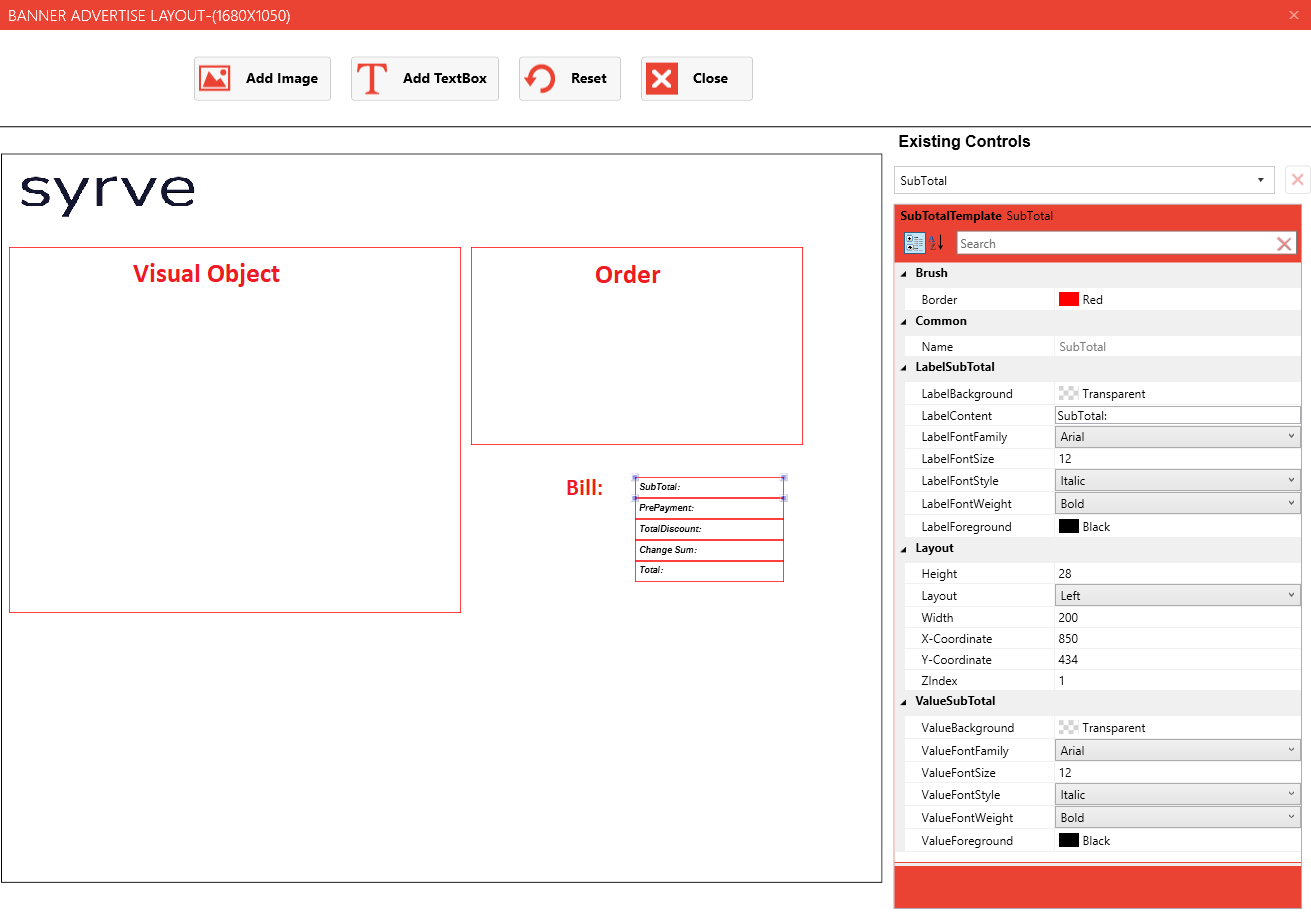 Tutaj obiekty można ustawić podobnie jak w trybie widoku rachunku. Jedyną różnicą jest zestaw obiektów – tutaj elementy danych zamówienia i rachunku nie są dostępne.