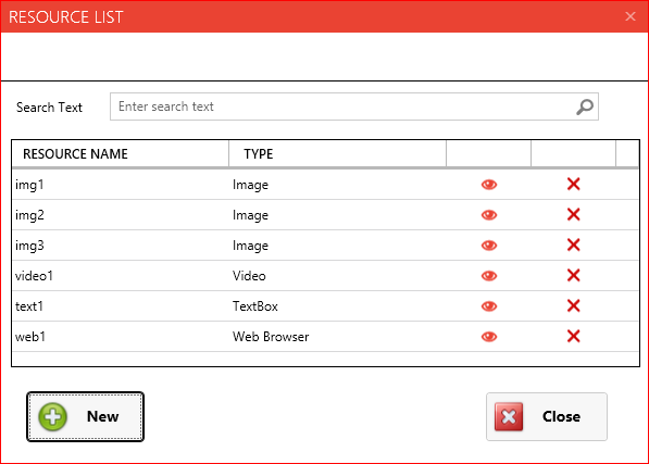 Aby dodać obraz do ekranu, kliknij Dodaj obraz. W polu Źródło właściwości tego elementu wybierz jeden z obrazów w bazie danych lub dodaj nowy. W tym celu naciśnij przycisk Nowy. Następnie postępuj zgodnie z instrukcjami podanymi w sekcji Zasoby.