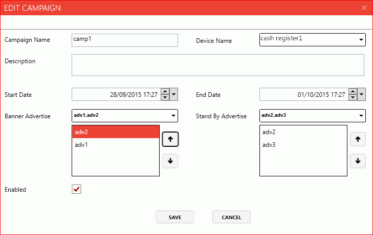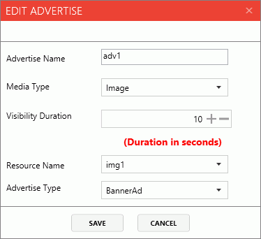 - W polach Reklama banerowa i Reklama w trybie oczekiwania określ obiekty wizualne, które będą wyświetlane odpowiednio w trybie widoku rachunku lub reklamy. Będą się one przełączać zgodnie z czasem określonym w ich właściwościach.
