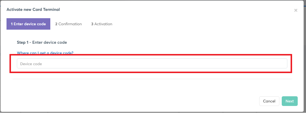 Wprowadź kod aktywacyjny wyświetlony na terminalu w wymaganym polu i wybierz Dalej.