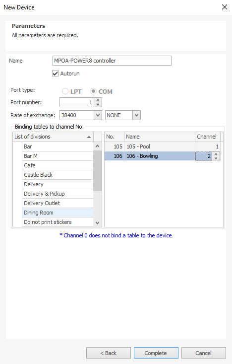 - Każdy stolik powinien być powiązany z kontrolerem. Na przykład dla stołów bilardowych jest to kontroler oświetlenia.