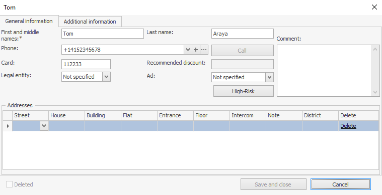 Pola Osoba prawna, Reklama oraz Wysokie ryzyko są używane w dostawie. Szczegóły znajdziesz w artykule Baza danych klientów w Podręczniku użytkownika Syrve Delivery.