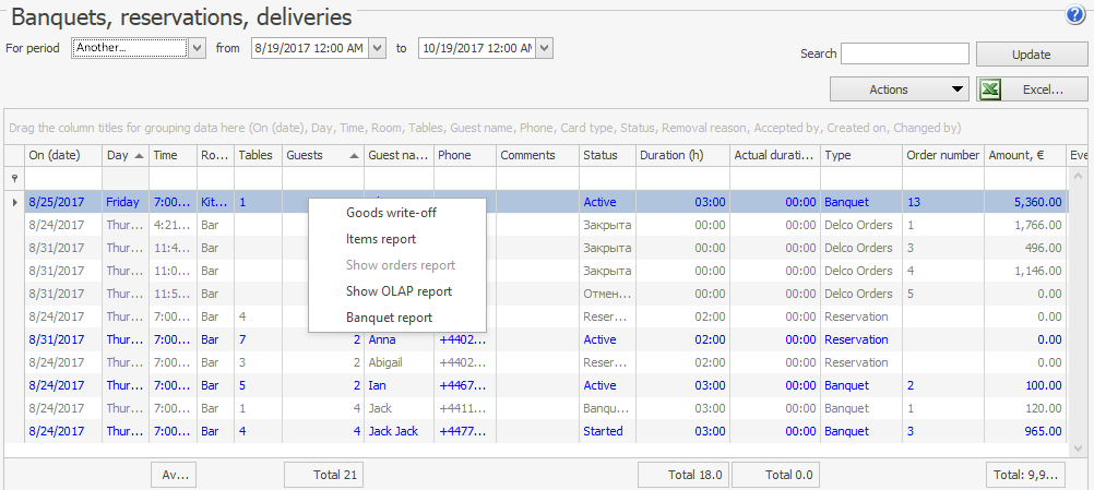 Raport transakcji OLAP można wykorzystać do uzyskania wszystkich niezbędnych informacji o zamówieniu bankietowym, przedpłacie, zwrocie przedpłaty, pełnej płatności za zamówienie lub płatności obejmującej przedpłatę. Można to zrobić za pomocą akcji Pokaż OLAP w raporcie Bankiety, Rezerwacje, Dostawy.