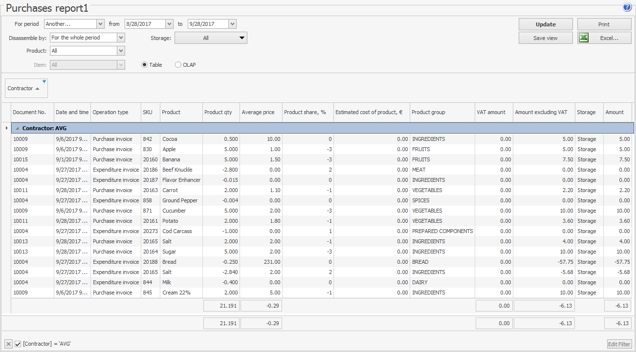 Aby utworzyć raport, kliknij Pokaż i dwukrotnie kliknij w wiersz odpowiadający raportowi. Określ okres sprawozdawczy i kliknij Aktualizuj. Zobaczysz listę towarów z ceną, ilością i kwotą, a także dostawcę.