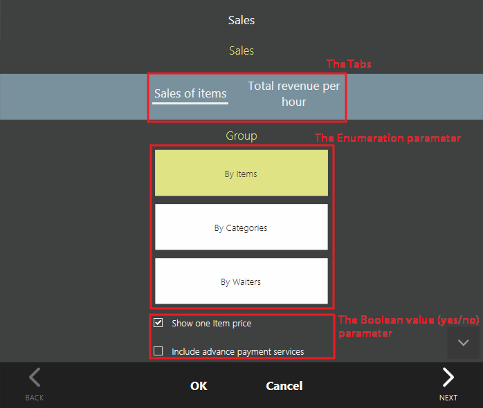 . Odpowiednio zmienia się tryb ekranu parametrów raportu w Syrve POS.