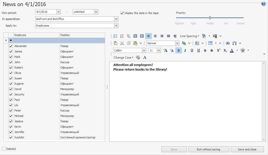 Określ okres i placówki, w których wiadomość powinna być wyświetlana, aplikacje Syrve (Syrve POS, Syrve Office lub Syrve POS i Syrve Office) oraz dla kogo jest przeznaczona – dla poszczególnych pracowników lub stanowisk. Kreator zapewnia wszystkie narzędzia do formatowania tekstu wiadomości.