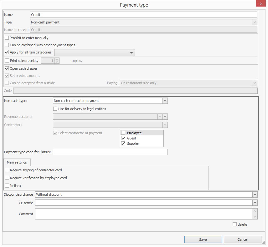 - Pracownik, gość lub dostawca jest wybierany podczas realizacji płatności tego typu w Front. Wybór kontrahentów do płatności na kredyt można ograniczyć, wybierając Pracownik, Gość lub Dostawca.
