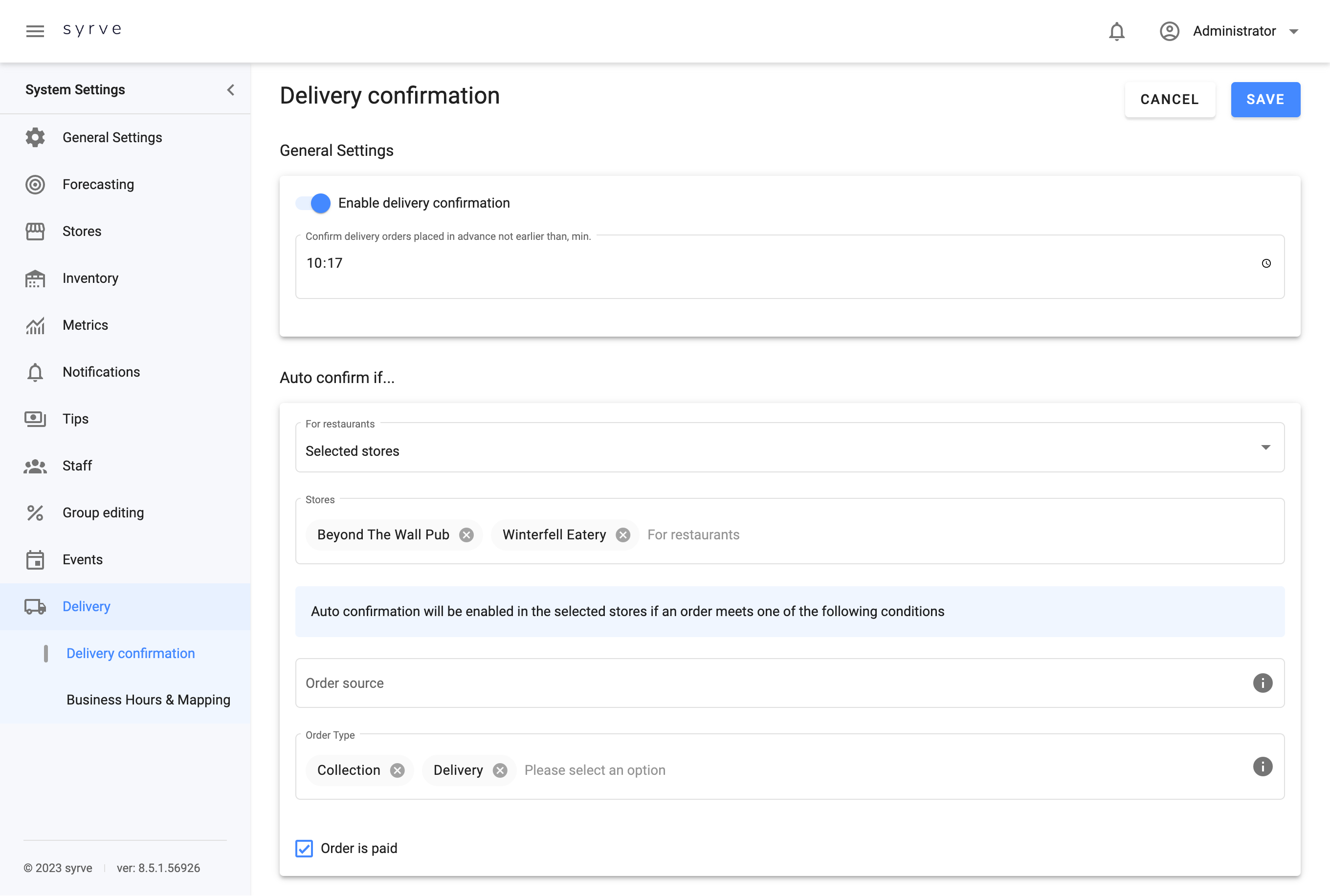 Aby automatycznie potwierdzać zamówienia na dostawę pochodzące z zaufanych platform, stron internetowych i aplikacji do zamawiania jedzenia skonfigurowanych przez Syrve Live API, a także zamówienia przedpłacone, włącz opcję Potwierdzenie dostawy znajdującą się w Syrve App > Ustawienia systemu i konserwacja > Dostawa > Potwierdzenie dostawy.