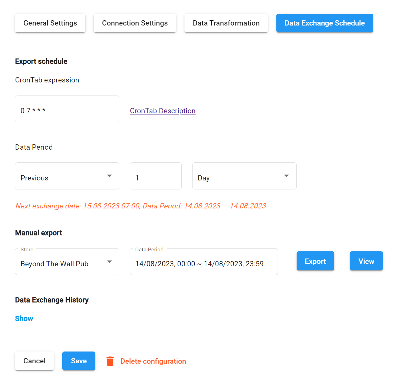 Na przykład, 0 7 * * * oznacza, że wymiana danych odbędzie się codziennie o 7:00 rano; 0 17 * * * — wymiana danych odbędzie się codziennie o 17:00; 0 8 * * 1 — raz w tygodniu w poniedziałek o 8:00 rano itd. Aby uzyskać więcej szczegółów i przykładów, zapoznaj się z Przewodnikiem CronTab.