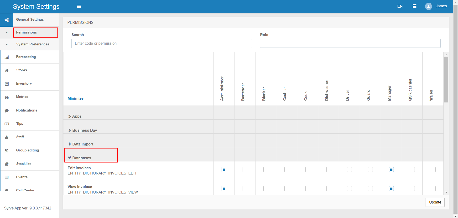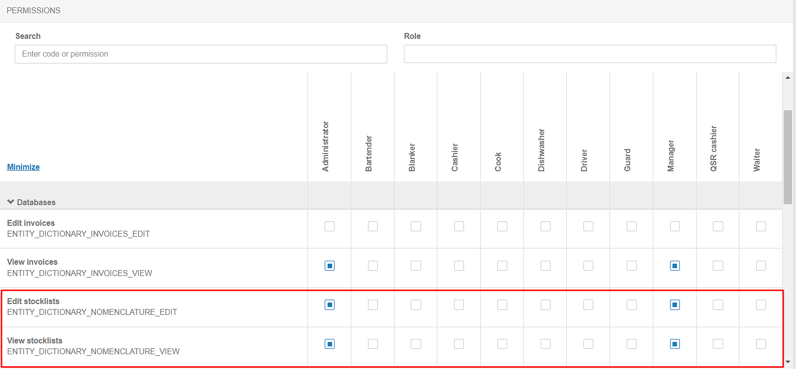 Aby nadać uprawnienia, zaznacz pola na przecięciu wiersza uprawnienia i kolumny roli użytkownika. Kliknij Aktualizuj. Poniżej znajduje się przykład ustawiania uprawnień dla bazy danych listy stanów magazynowych: