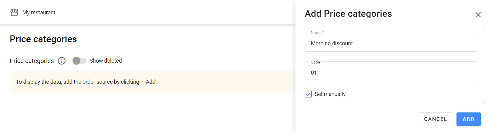 Kategorie cenowe ustalają różne opcje cenowe dla pozycji w oparciu o warunki sprzedaży. Są to szablony z określonym rabatem lub dopłatą używane do ustalania specjalnych cen na produkty i usługi. Na przykład możesz utworzyć takie kategorie cenowe jak Bankiet lub Szczęśliwa godzina, aby zmienić cenę pozycji zamawianej w określonych godzinach lub podczas bankietu.
