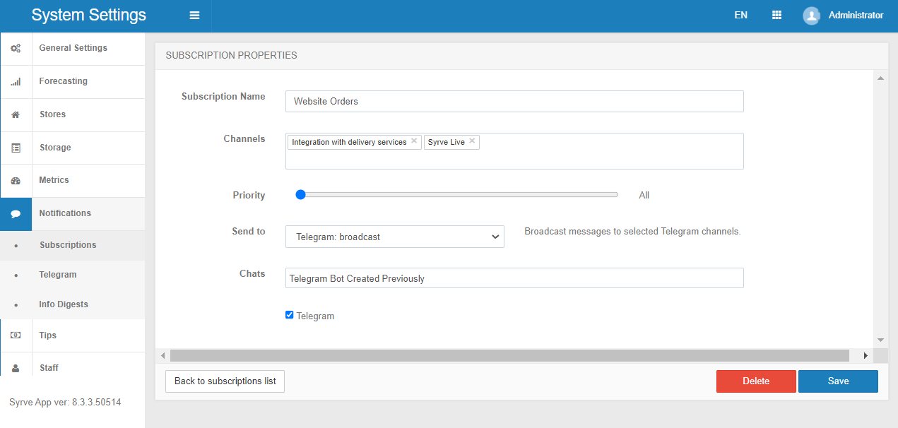 W Właściwościach subskrypcji wybierz tagi 'Integracja z usługami dostawy' oraz 'Syrve Live'.