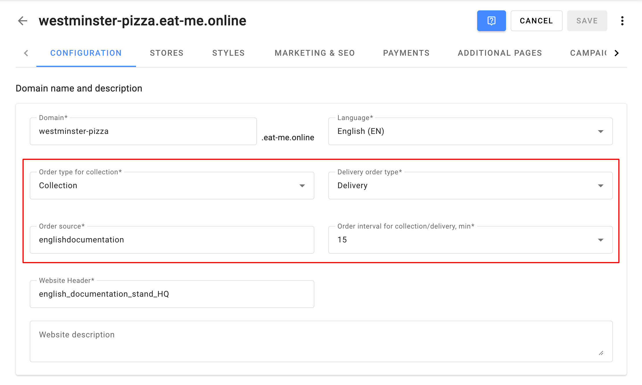 Wybierz typy zamówień na dostawę i odbiór. Pola te są wstępnie wypełnione i możesz pozostawić je bez zmian.