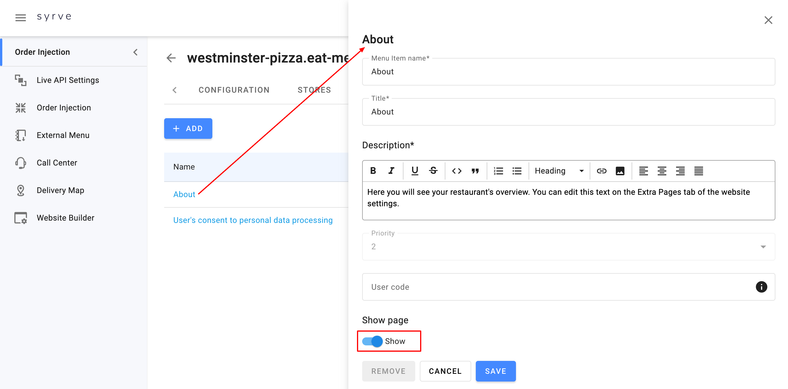 Użyj strony O nas, aby szczegółowo opowiedzieć klientom o swojej restauracji i dostawie. Możesz dodać mapę pokazującą obszary, do których dostarczasz. Aby wyświetlić stronę na swojej witrynie, ustaw przełącznik Pokaż stronę w pozycji "Pokaż".