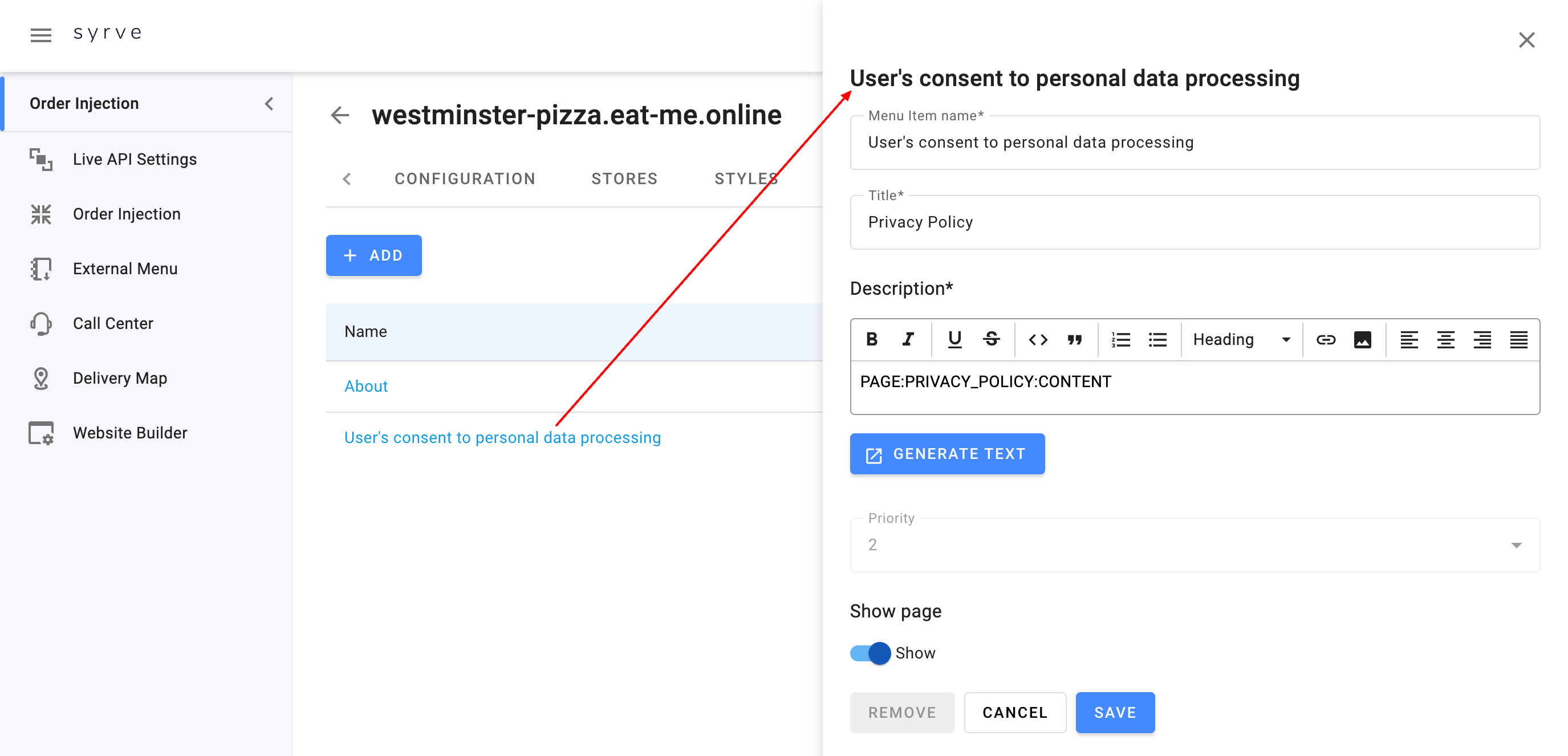 Dostosuj stronę Zgoda użytkownika na przetwarzanie danych osobowych, aby wyświetlić tekst zgody na swojej stronie internetowej. Edytuj Nazwa pozycji menu, Tytuł i ustaw przełącznik Pokaż stronę w pozycji "Pokaż". Aby automatycznie wygenerować tekst zgody, kliknij Generuj tekst i wypełnij dane swojej firmy. Zapisz zmiany.