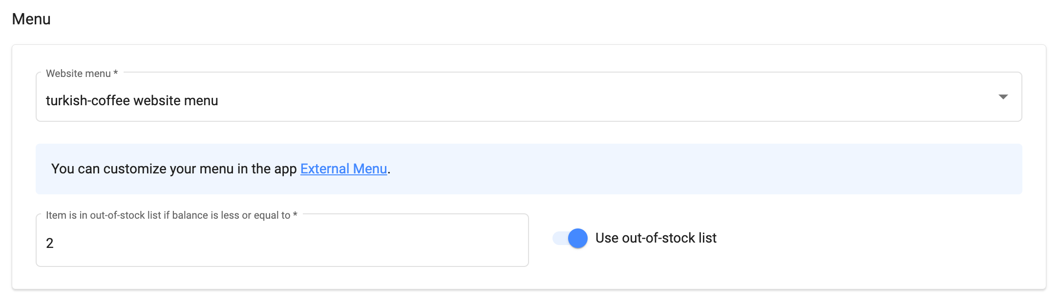 W bloku Menu możesz zmienić menu wybrane w Kroku 1 oraz włączyć listę produktów niedostępnych. Jeśli zaznaczysz opcję Użyj listy niedostępnych produktów, Twoi goście nie będą mogli zamówić niedostępnych produktów ani dodać ich do koszyka. Takie produkty będą wyszarzone w Twoim menu online.