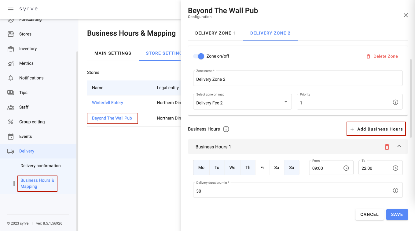 Opłata za dostawę, Strefy dostawy oraz godziny pracy są konfigurowane w aplikacji Godziny pracy i mapowanie.