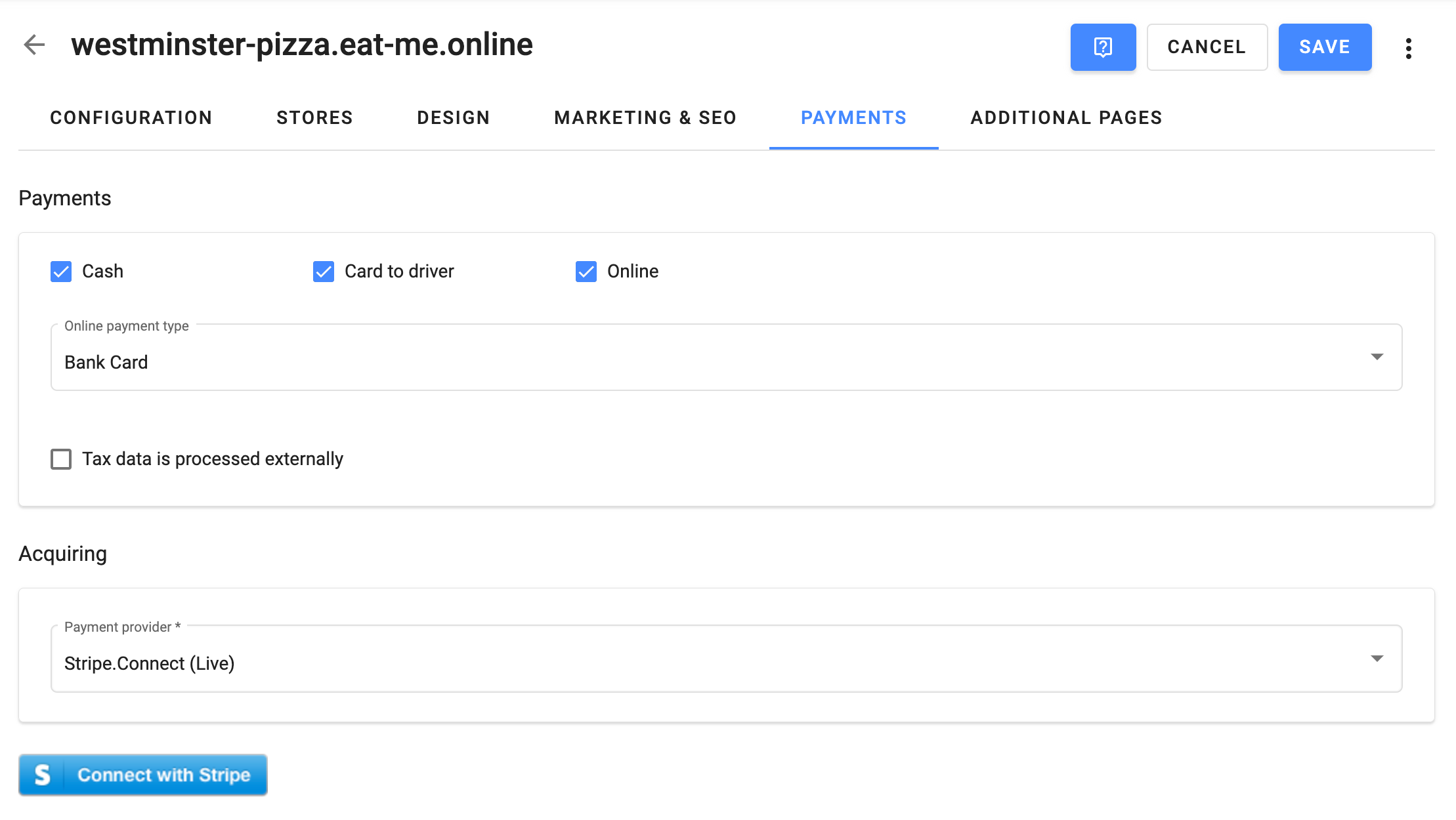 - W polu Płatność wybrane są opcje „Tylko zewnętrzne” lub „Zarówno zewnętrzne, jak i po stronie restauracji”.