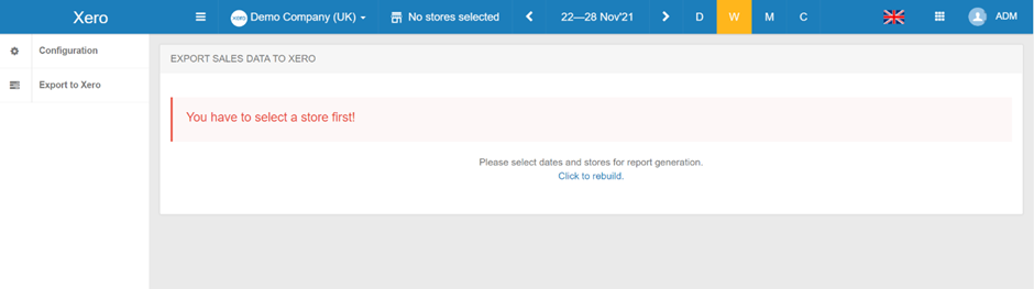 Aby wybrać sklep, kliknij tam, gdzie jest napisane 'No store Selected' w niebieskim pasku. Możesz wybrać wszystkie sklepy lub konkretny sklep do eksportu do Xero.