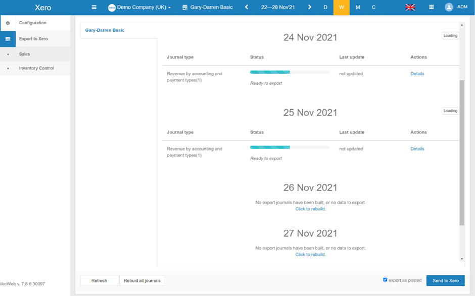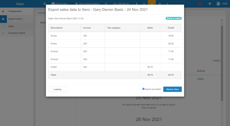 Aby utworzyć dzienniki w Xero jako zaksięgowane, upewnij się, że opcja Eksportuj jako zaksięgowane w prawym dolnym rogu ekranu jest zaznaczona.Następnie naciśnij przycisk Wyślij do Xero, aby wyeksportować wszystkie zbudowane dzienniki za wybrany okres.