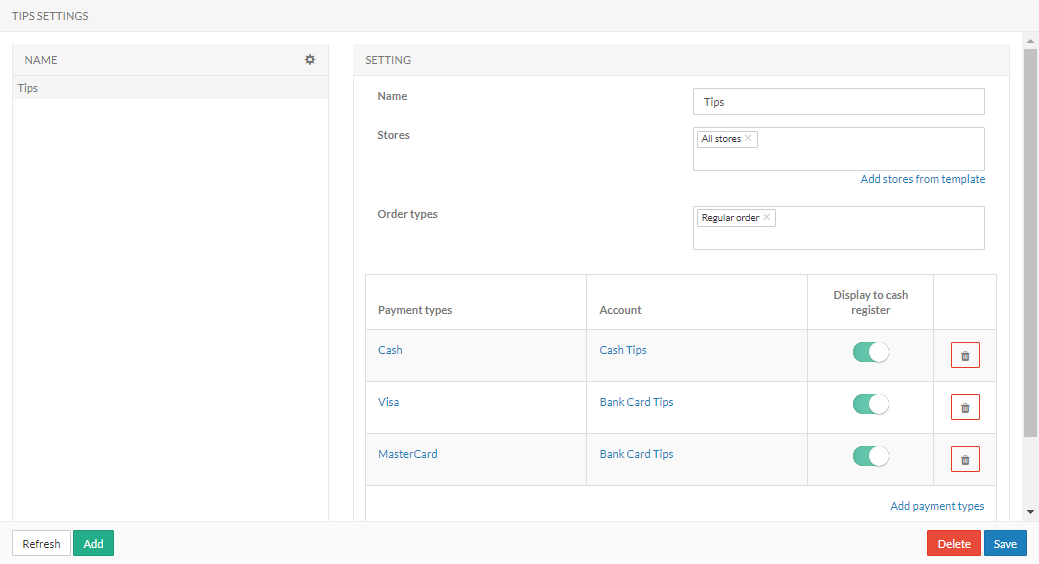 W Syrve mamy kilka trybów obsługi: Zamówienie zwykłe, Dostawa lub Odbiór. Załóżmy, że realizujesz dostawy, ale napiwki nie są skonfigurowane dla tego typu zamówienia lub są rejestrowane na innych kontach. W takim przypadku musisz wykonać dodatkowe ustawienia.