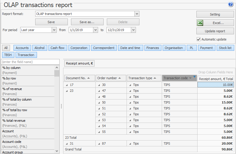 Kwoty napiwków mają generowane transakcje TIPS i są obciążane z konta określonego w ustawieniach napiwków oraz uznawane na koncie „Przychód nierozdzielony”. Numer zmiany jest podany w polu Numer dokumentu. Aby uzyskać szczegółowe informacje, użyj pola Numer zamówienia.