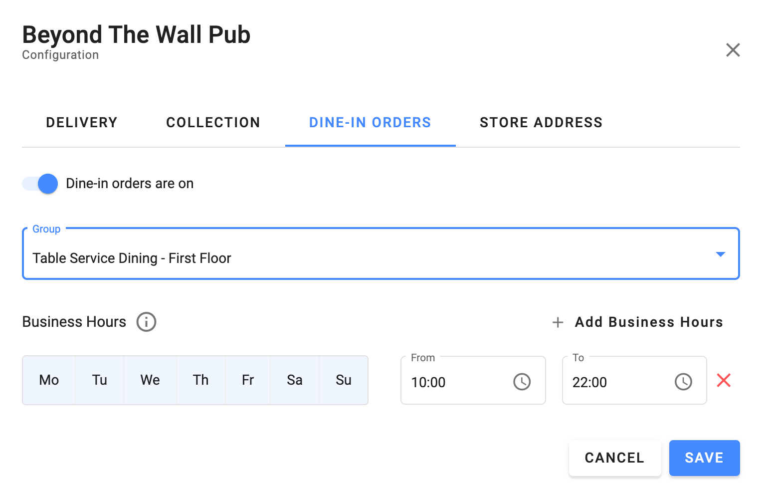 Aby dodać godziny pracy dla trybu odbioru, kliknij Dodaj godziny pracy. Czasy dostawy i odbioru mogą się różnić.