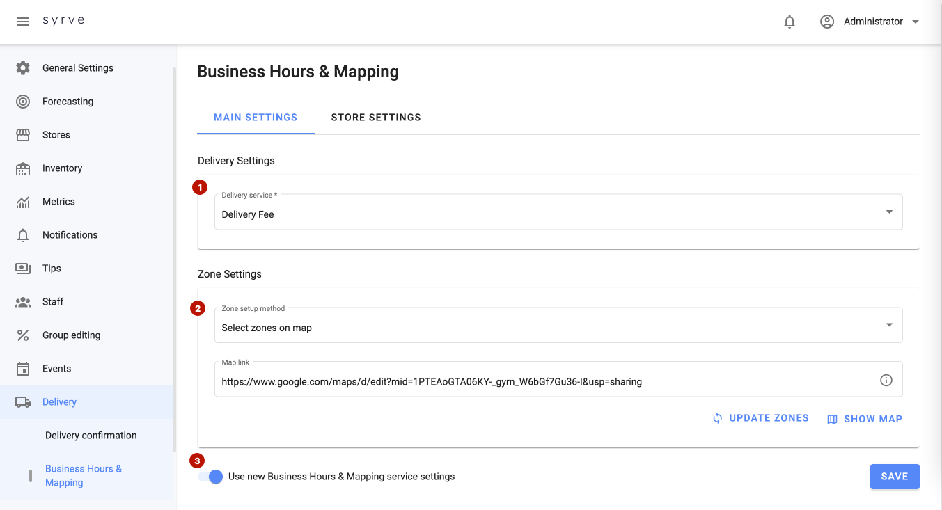 - Wybierz strefy na mapie. Zamówienia będą dostarczane w obrębie określonej strefy. W polu Link do mapy dodaj link do mapy z wcześniej skonfigurowanymi na Google Maps strefami dostawy i kliknij IMPORTUJ STREFY. W ten sposób Twoje strefy narysowane w usłudze Moje Mapy zostaną zaimportowane do Syrve.