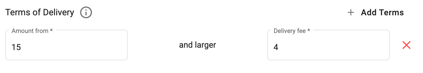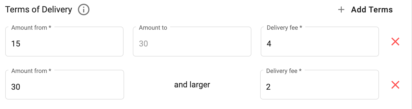 Skonfiguruj warunki dostawy — kwotę zamówienia oraz Opłatę za dostawę. Kwota zamówienia (Kwota od, Kwota do) to łączna cena wszystkich pozycji zamówienia po rabatach, ale bez uwzględnienia wykorzystanych nagród. Opłata za dostawę zostanie automatycznie dodana do ceny zamówienia zgodnie z warunkami.