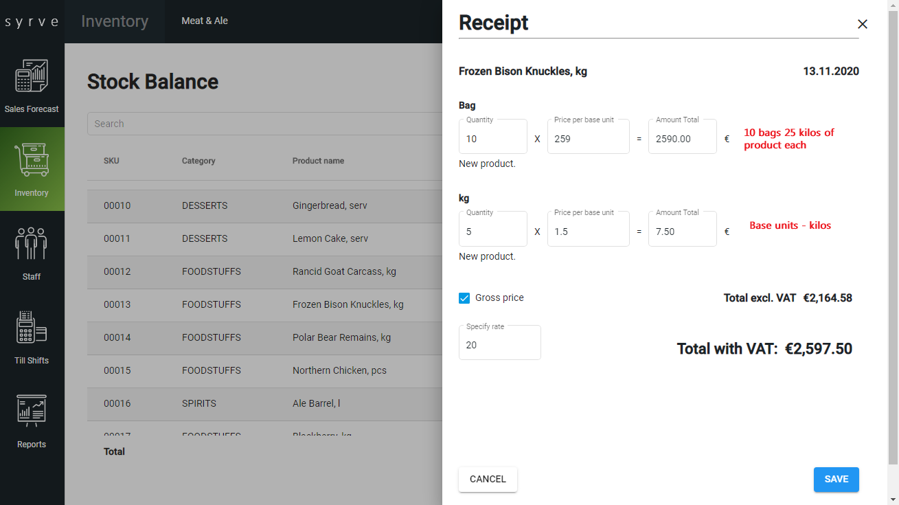 Wszystkie Twoje zakupy powinny być rejestrowane w Syrve. W ten sposób zawsze możesz wiedzieć, ile jedzenia pozostało na stanie. Na tej podstawie możesz zdecydować, czy musisz kupić produkty spożywcze, czy jest na to jeszcze za wcześnie.