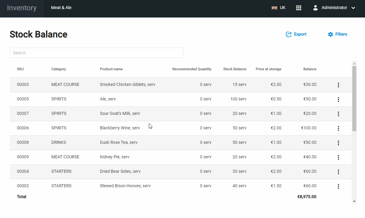 Jeśli dopiero zaczynasz pracę z Syrve, tabela Saldo stanu może być pusta. Przejdź do aplikacji Menu i Ceny, aby dodać potrzebne produkty do sklepu. Szczegóły znajdziesz w artykule Produkty.