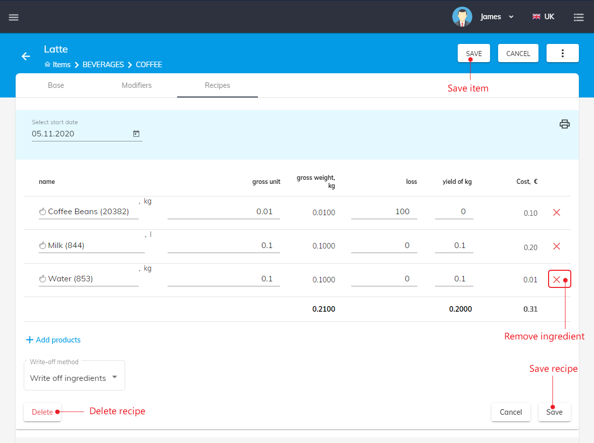 Pozycje menu, półprodukty i modyfikatory mogą mieć przepis.