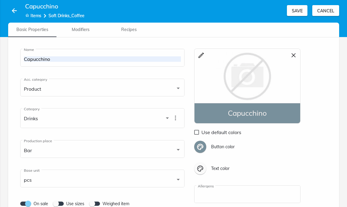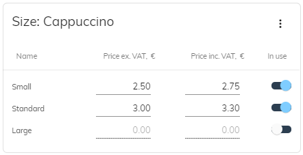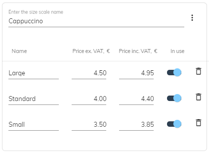 Dodaj Espresso do tej samej grupy Kawa. Będzie miało skalę rozmiarów, którą utworzyłeś dla Cappuccino. Ta zasada dotyczy wszystkich pozycji w grupie. W ten sposób możesz szybko stworzyć kilka pozycji z tymi samymi rozmiarami.