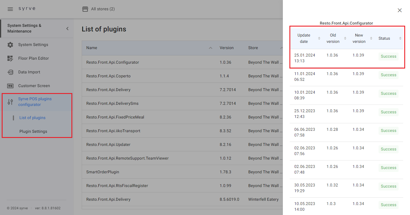 Użyj sekcji Ustawienia systemu i konserwacja > Konfigurator wtyczek Syrve POS, aby sprawdzić zainstalowane wtyczki na terminalach POS: