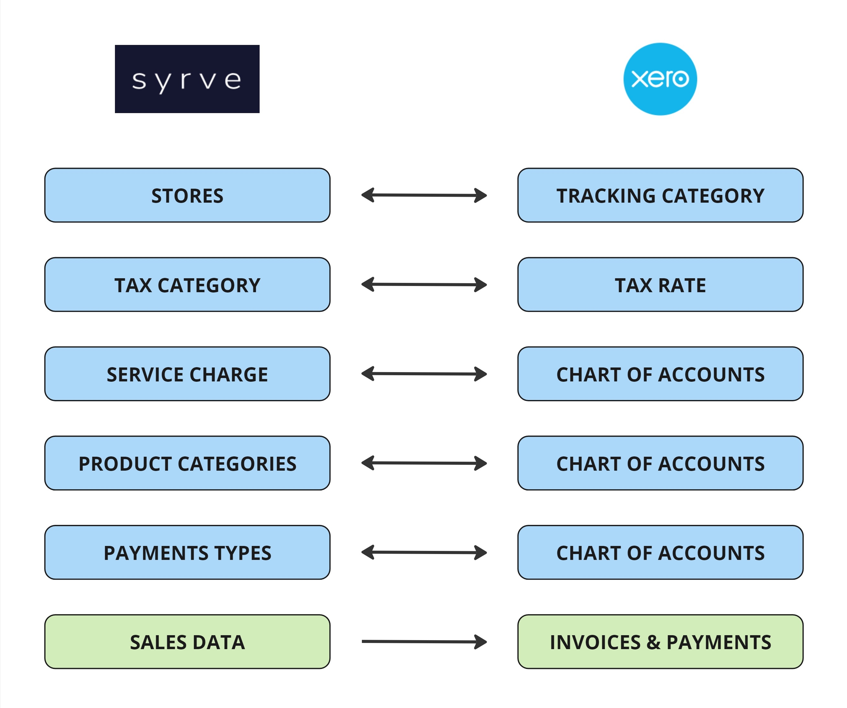 Proszę zobaczyć poniższy schemat przepływu danych Syrve do Xero: