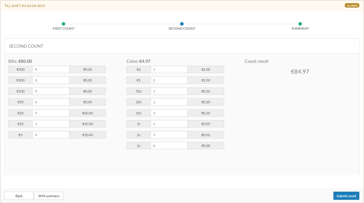 Pierwsze liczenie. Będąc w trybie zarządzania restauracją — Rutynowe operacje restauracyjne, kasjer powinien przejść do Zmiany kasowe > Aktywne zmiany i kliknąć Akceptuj naprzeciwko zmiany kasowej. Następnie wykonać Pierwsze liczenie: wprowadzić liczbę banknotów i monet każdego nominału i kliknąć Zatwierdź liczenie.